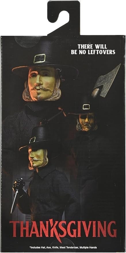 figura de acción de Ultimate John Carver está altamente articulada y viene con todos los adornos: mosquete, mazo, hacha, pistola de dardos, ablandador de carne, cuchillos, sombrero removible, manos adicionales y tres máscaras intercambiables. La figura a escala de 7 pulgadas viene en una caja con ventana para coleccionistas con solapa de apertura.