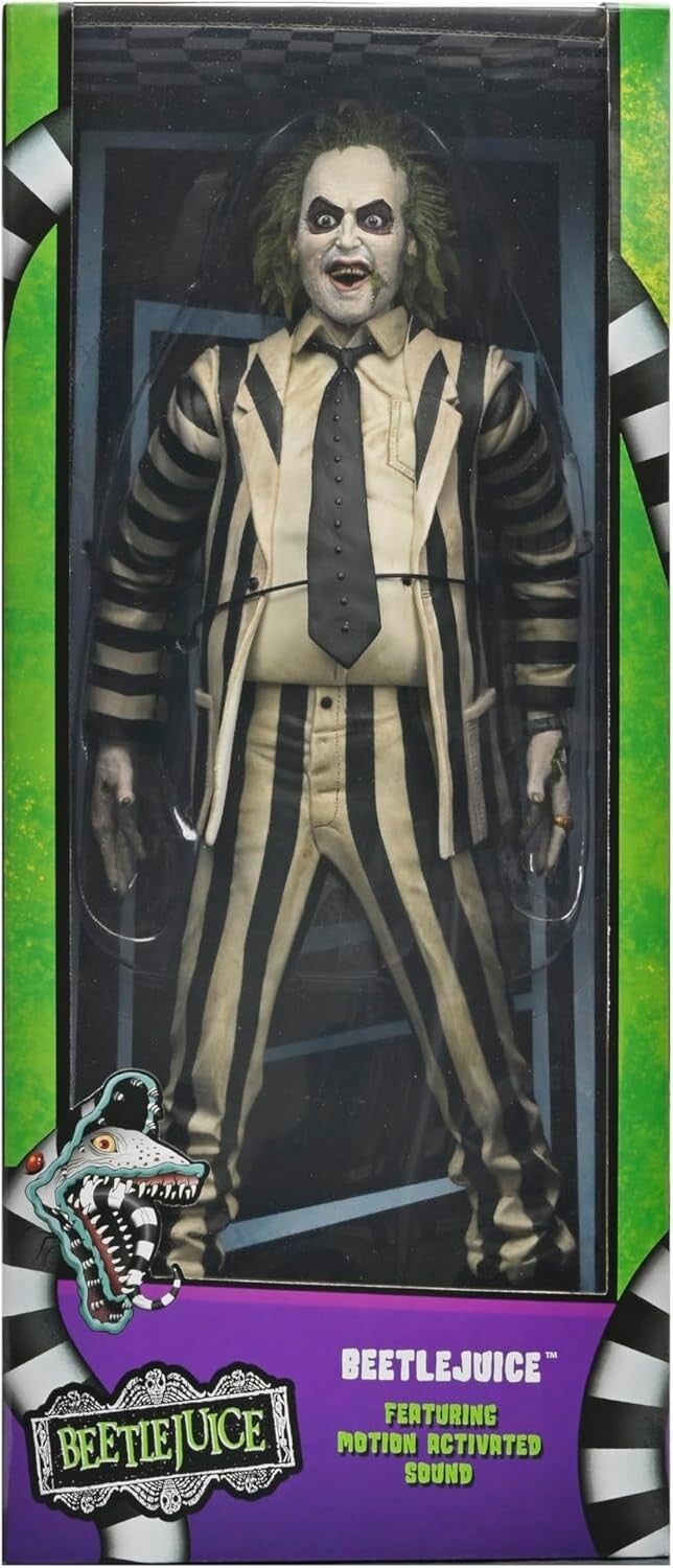 La Figura Beetlejuice con Sonido (45,5 cm) es una representación fiel del excéntrico protagonista de la película de culto Beetlejuice (1988). Con una altura de 45,5 cm, esta figura destaca por su detallado diseño, que incluye su característico traje a rayas blanco y negro, y al activarse por movimiento, reproduce frases originales de la película, como "¡Beetlejuice, Beetlejuice, Beetlejuice!".